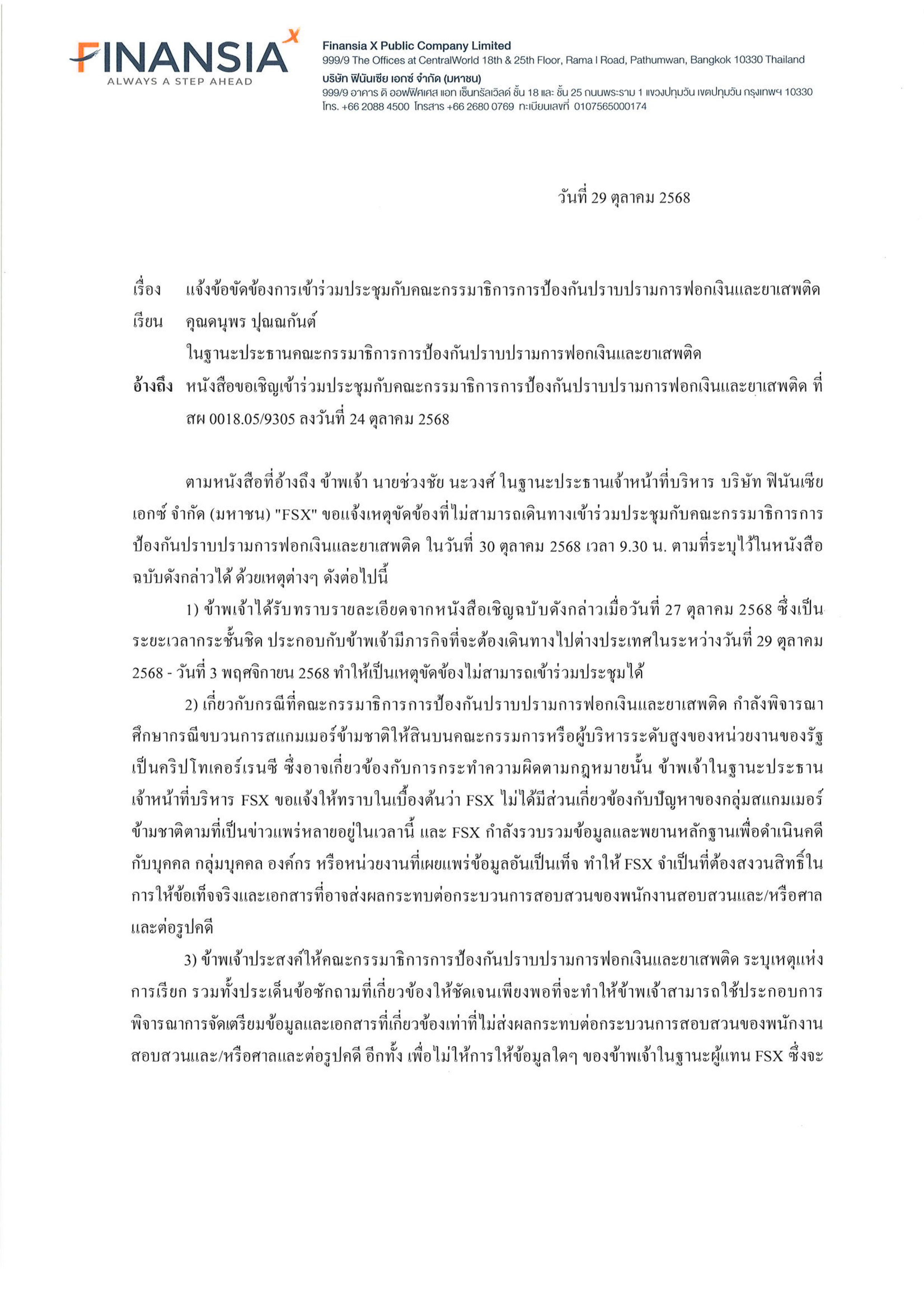 แจ้งข้อขัดข้องการเข้าร่วมประชุมกับคณะกรรมาธิการการป้องกันปราบปรามการฟอกเงินและยาเสพติด