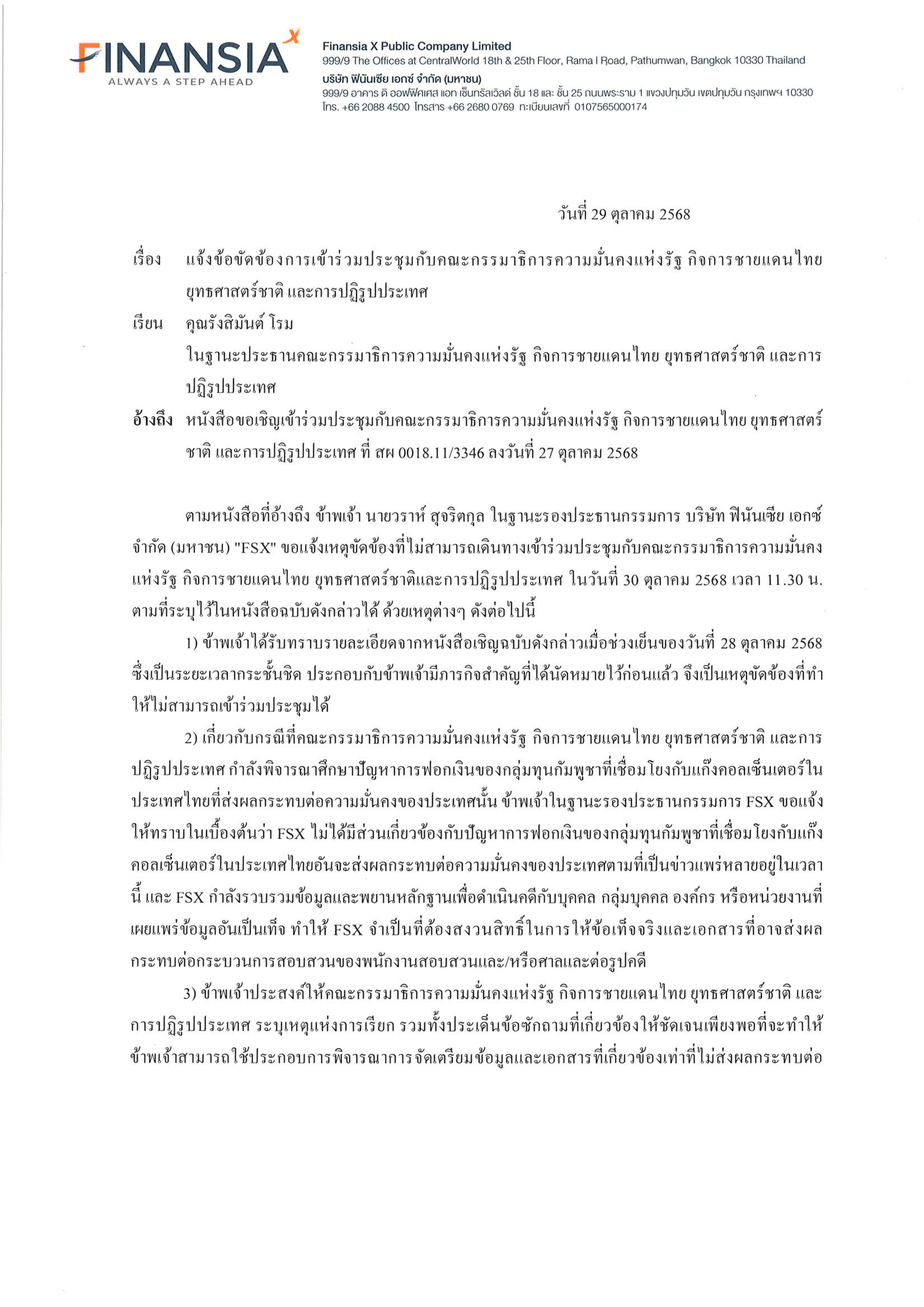 แจ้งข้อขัดข้องการเข้าร่วมประชุมกับคณะกรรมาธิการความมั่นคงแห่งรัฐ กิจการชายแดนไทยยุทธศาสตร์ชาติ และการปฏิรูปประเทศ